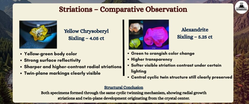 The alexandrite specimen shows softer visual striation contrast under certain lighting due to higher transparency and color-change effect.