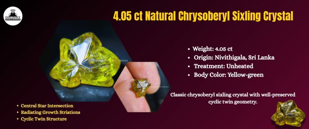 Sri Lanka has long been known as one of the world’s most important gem-bearing regions. Among its many treasures, chrysoberyl crystals hold a special place — particularly the rare cyclic twin formations known as sixling crystals. These are not common gem-trade materials; they are crystallographic phenomena preserved in natural form.
