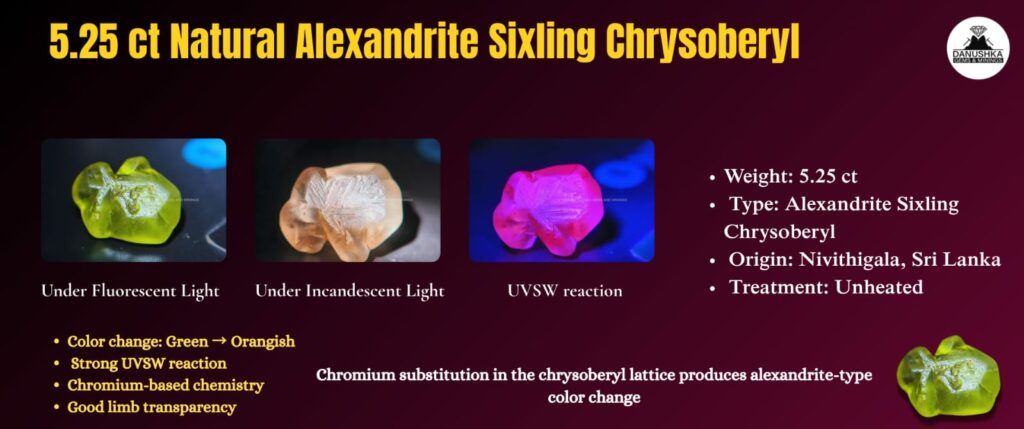 The UVSW reaction indicates chromium presence and confirms its alexandrite-type chemistry rather than standard iron-dominant chrysoberyl.