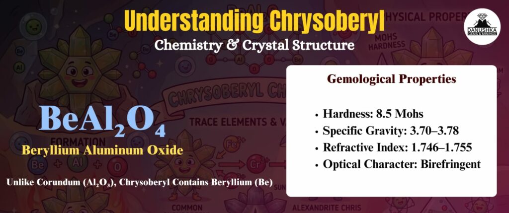 Unlike corundum (Al₂O₃), chrysoberyl contains beryllium, which significantly affects crystal structure and physical behavior.