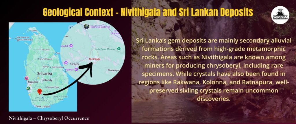 Nivithigala is recognized among local miners as a productive area for chrysoberyl, including alexandrite occurrences.