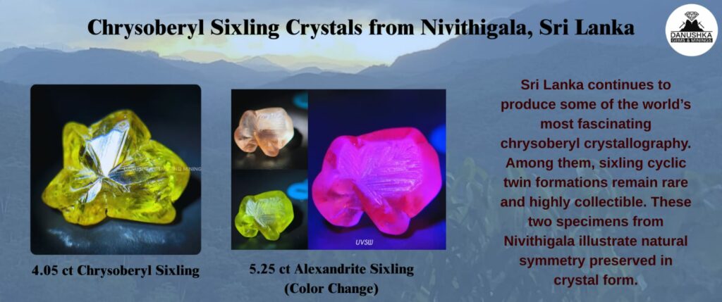 At Danushka Gems & Minings, we have encountered such specimens from Nivithigala village around mining in Sri Lanka, as well as historically from Kolonna, Rakwana, Ratnapura, Pelmadulla, Embilipitiya, Deniyaya, Balangoda, and Hunuwala. However, even within these productive regions, well-preserved sixling crystals are not regularly seen. In practical mining reality, they may appear only occasionally — sometimes once a year in small numbers — making them highly interesting to mineral collectors.