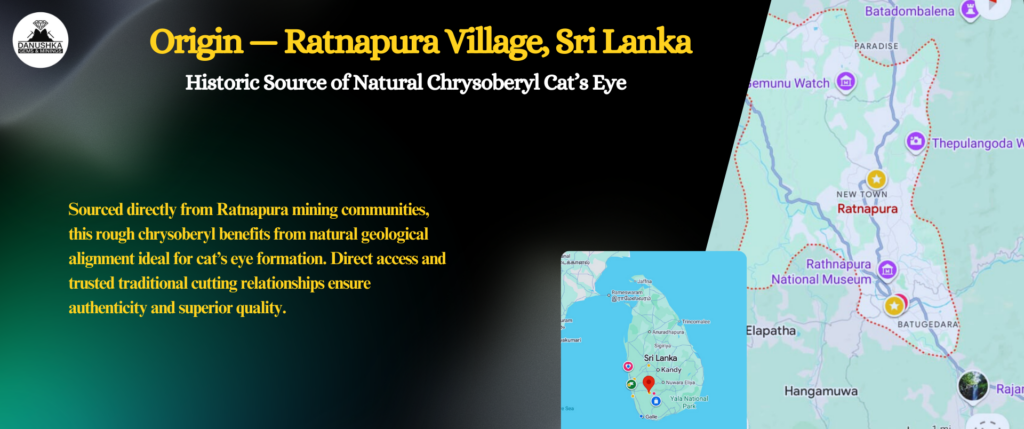 Ratnapura remains one of the world’s historic sources of Chrysoberyl Cat’s Eye. The geological environment produces stones with strong fibrous structure suitable for fine chatoyancy.