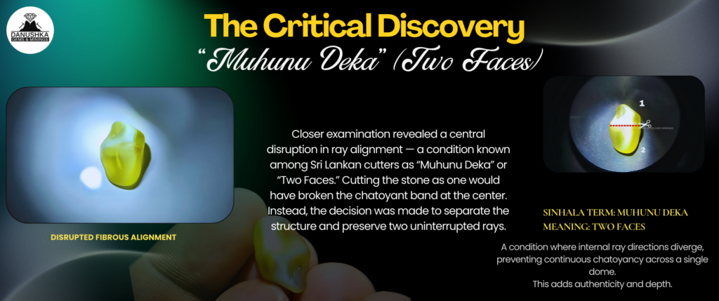 The original rough showed a split internal fiber alignment, locally called “Muhunu Deka” (two faces). Cutting it as one stone would have broken the ray. Trimming into two pieces preserved stronger chatoyancy in each stone.
