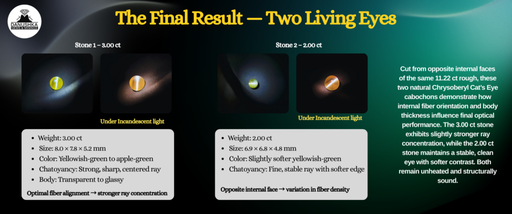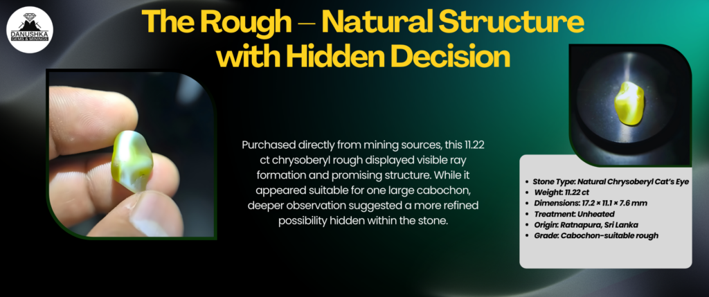 This is the story of an 11.22 carat natural Chrysoberyl Cat’s Eye rough sourced directly from Ratnapura village around mining in Sri Lanka — and how careful observatin transformed what appeared to be one stone into two perfectly formed living eyes.