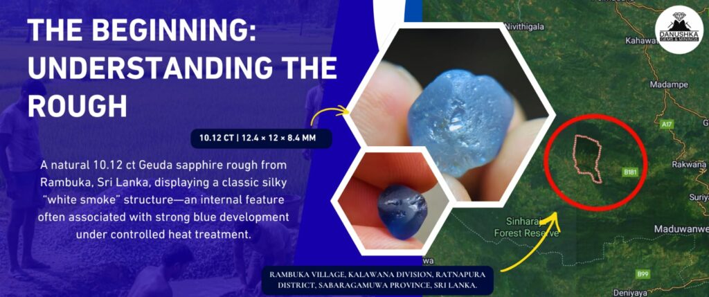This sapphire began as a facet-grade natural Geuda sapphire rough weighing 10.12 carats, measuring 12.4 × 12 × 8.4 mm, sourced directly from Rambuka village around mining in Sri Lanka. The stone showed a classic silky milky internal structure, often described locally as white smoke. Such internal silk is widely recognized as a strong indicator of good heating potential for blue sapphire development.