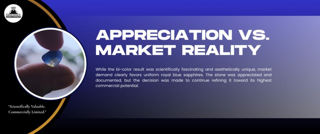 Scientifically and aesthetically, the bi-color result was fascinating. Bi-color sapphires are rare, and beautiful in their own way. From a research perspective, this outcome was valuable—it confirmed the presence of mixed Geuda characteristics within a single crystal and demonstrated how different furnace environments interact with internal chemistry.