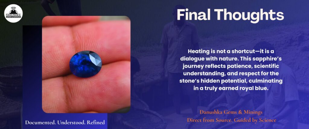 At Danushka Gems & Minings, we work directly from the source and approach heating with respect for both science and nature — documenting every step, embracing surprises, and guiding each stone toward its best possible outcome.