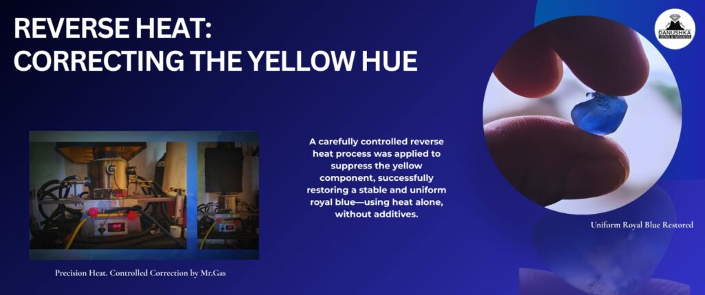 The yellow hue was removed, and the stone returned to a stable, uniform royal blue. This confirmed that the yellow reaction, while permanent in formation, could still be managed and corrected through precise thermal control.