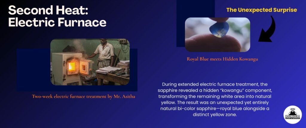 Kowangu Geuda is a known type in Sri Lanka that responds differently to heat, often developing yellow coloration under certain conditions. The key point here is that this reaction was permanent and natural, not an artificial effect. The stone had always carried this internal chemistry—it simply had not revealed itself earlier.