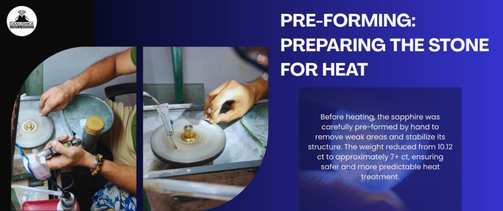 After pre-forming, the weight reduced from 10.12 ct to approximately 7+ ct. This step ensured that internal stress points were minimized and that heat could interact evenly with the stone’s internal structure. Pre-forming was carried out personally by the owner of Danushka Gems & Minings, ensuring full control and understanding of the stone before heating.