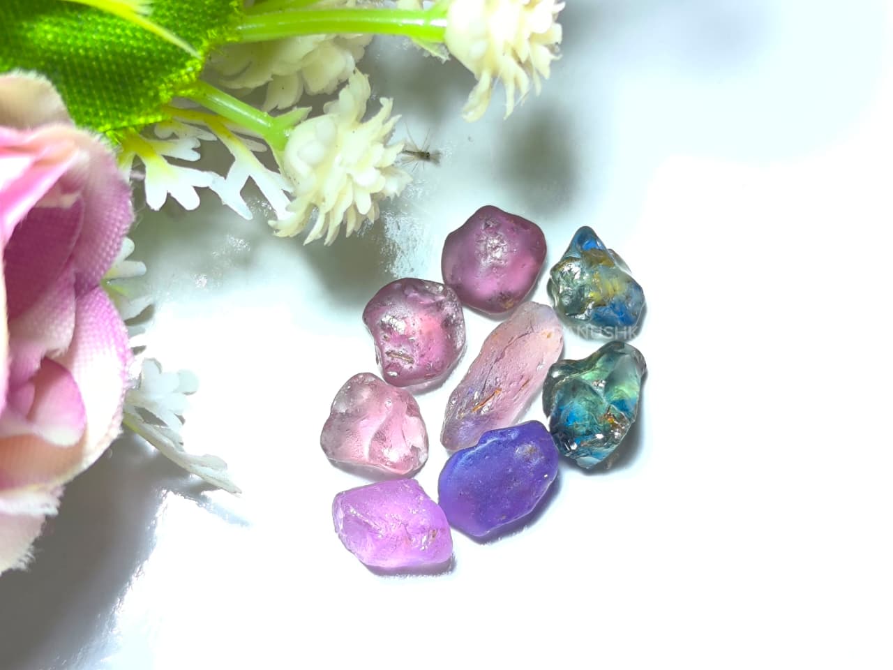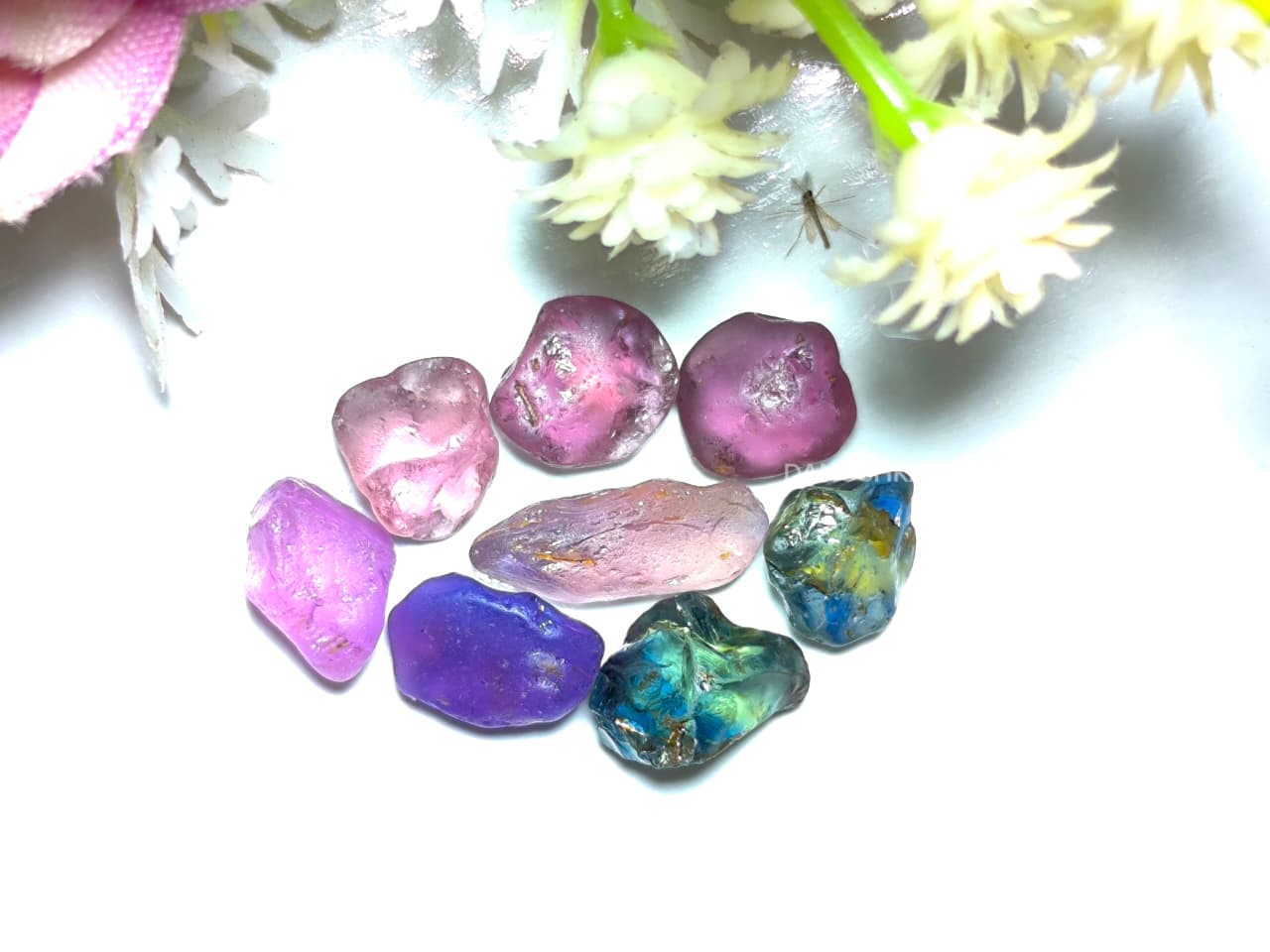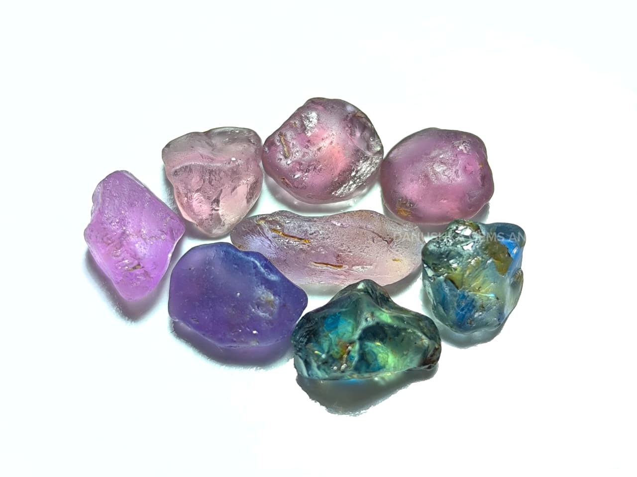 The parcel also features attractive blue-green, blue yellow-green, purple, and pink sapphires. Each piece shows promising cutting orientation, natural crystal structure, and usable transparency zones suitable for skilled faceting.
