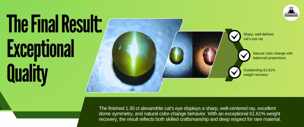 The finished gemstone weighs 1.30 carats, with final dimensions of 6.1 × 5.8 × 4.1 mm. The result is a very fine quality alexandrite cat’s eye displaying: