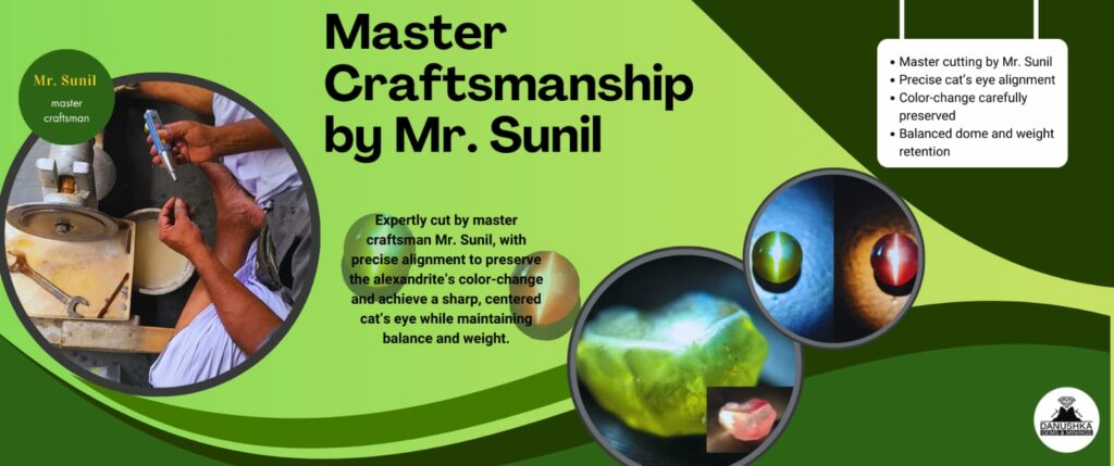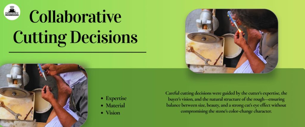 The cutting process was led by Mr. Sunil, a master craftsman renowned for his work with cat’s eye stones. His role was critical in evaluating the rough, identifying the optimal orientation, and aligning the chatoyant ray precisely along the stone’s axis.