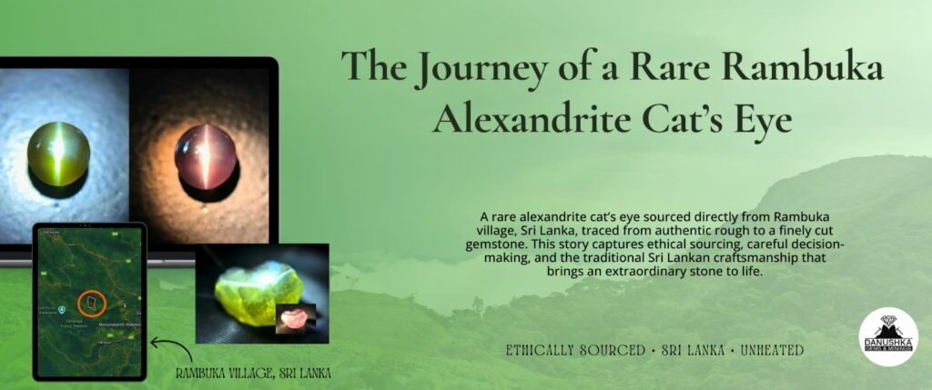 This article documents the full journey of a rare alexandrite rough sourced directly from Rambuka village, tracing its transformation from natural rough to an exceptional finished alexandrite cat’s eye gemstone. It is a real example of ethical sourcing, skilled decision-making, and traditional Sri Lankan cutting expertise.