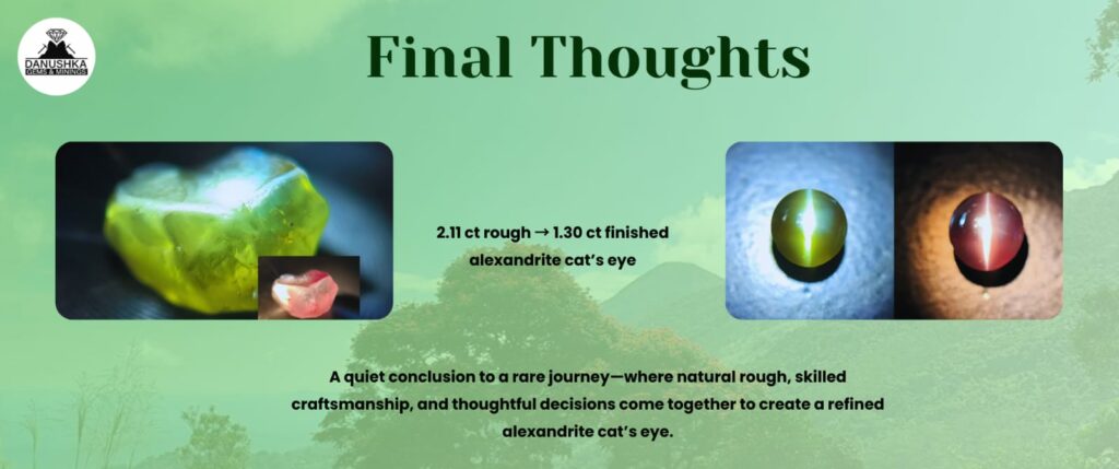 This alexandrite cat’s eye represents more than a beautiful gemstone—it reflects the value of direct sourcing, honest evaluation, and traditional expertise. From Rambuka village to the cutter’s bench, every step respected the stone’s natural character and potential.